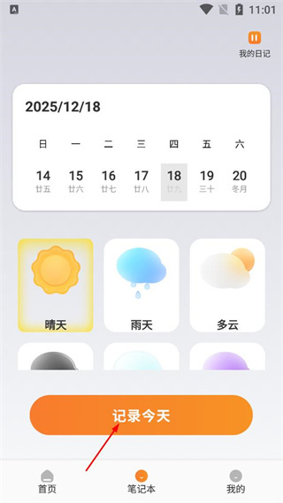 3、在笔记本页面,看到记录今天按钮,点击这个按钮,进入日记编辑的发布页面。