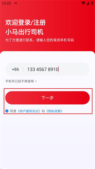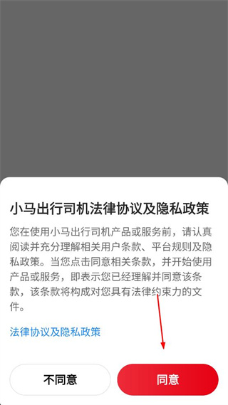 1、打开小马出行司机,阅读法律协议及隐私政策,确认内容后点击同意按钮。