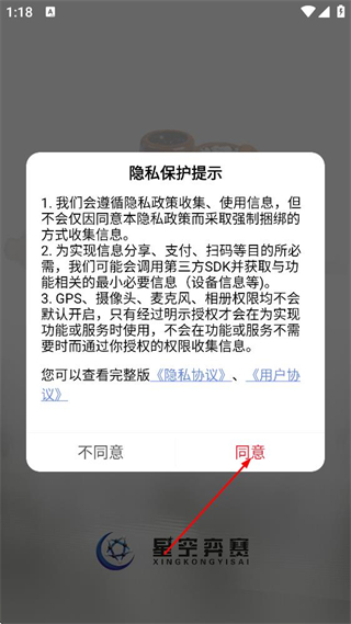 1、在星空弈赛的隐私保护提示弹窗中,点击同意,进入登录页面。