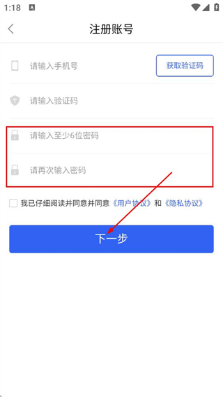 4、在注册账号页面,填写符合要求的密码及确认密码,点击下一步,完成账号注册。