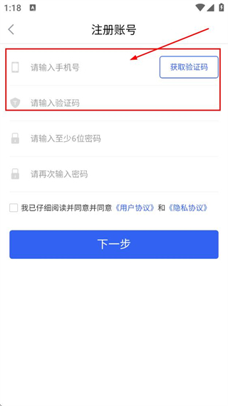3、在注册账号页面,填写手机号,并将收到的验证码填入请输入验证码输入框。