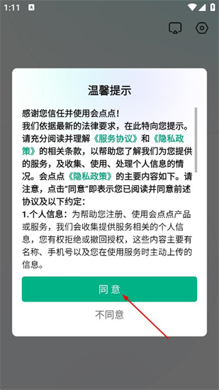 1、在会点点的温馨提示弹窗中,点击同意,进入会点点的主页面。