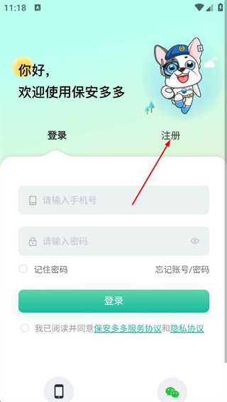 2、在你好,欢迎使用保安全多页面,点击右上角的注册,切换至注册操作界面。