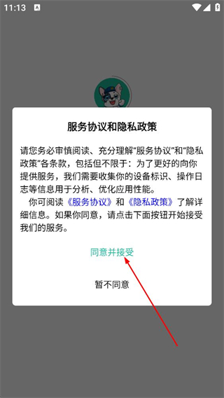 1、在保安全多的服务协议和隐私政策弹窗中,点击同意并接受,进入欢迎页面。