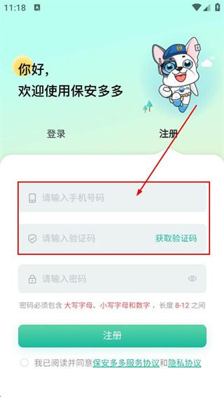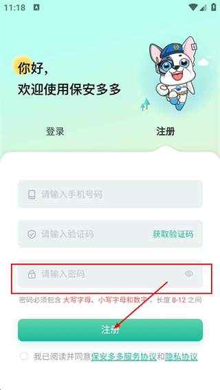 4、在注册界面,填写符合要求的密码,点击注册按钮,完成保安全多的账号注册。