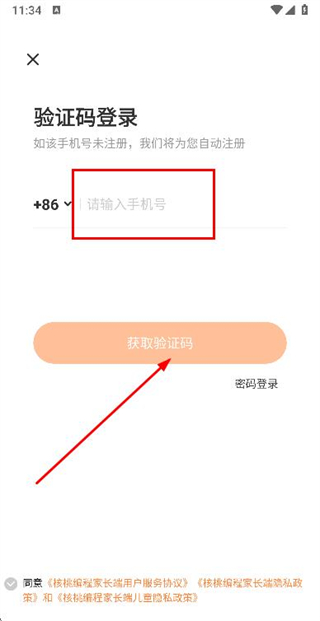 2、在手机登录页面填写手机号,勾选协议后,点击获取验证码。