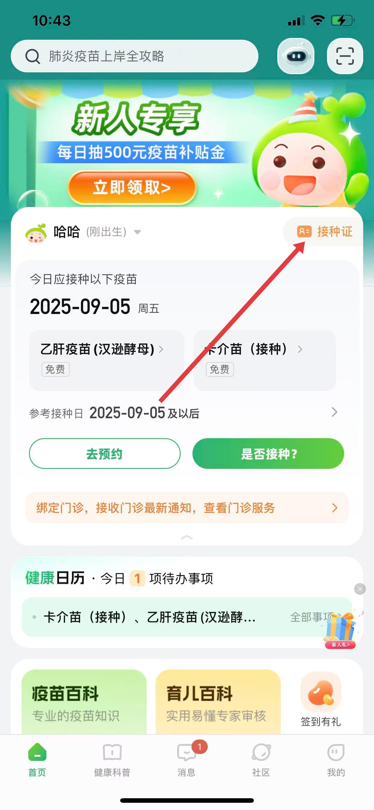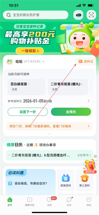 1、打开小豆苗App,进入首页,点击右上角的接种证图标。