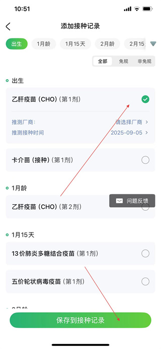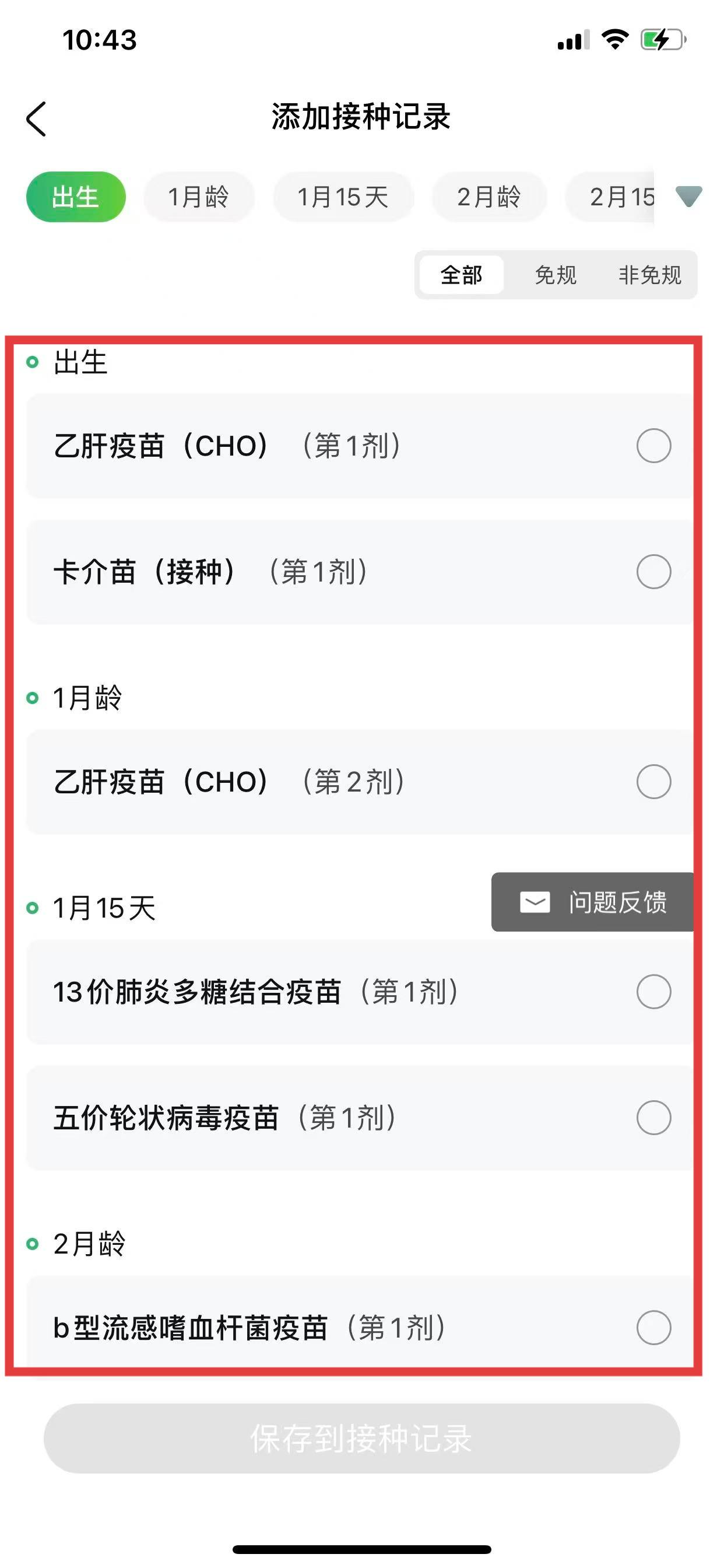 3、在添加接种记录页面选择已接种的疫苗,点击保存到接种记录按钮完成添加。