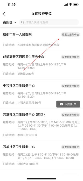 2、选择所在地区和想要设置的接种点,点击右侧的设置为接种单位。