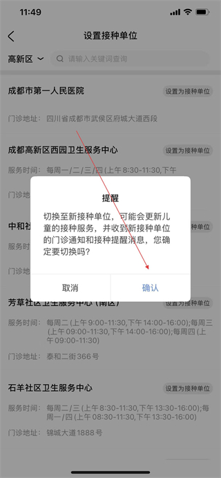 3、在提醒弹窗中点击确认,即可完成接种点设置。