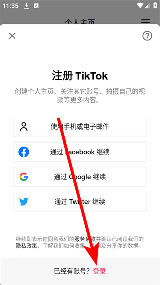 2、在个人主页的注册TikTok界面中,点击下方的登录,进入登录选择页面。