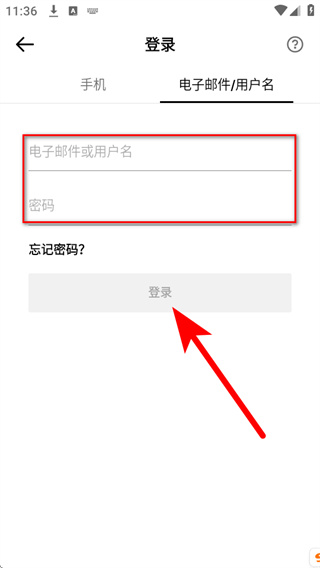 4、进入登录信息填写页面,切换至电子邮件、用户名登录