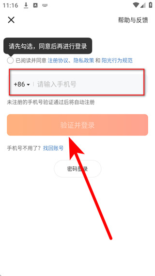 3、在登录页面,先勾选协议复选框,再在手机框填写号码,点击获取短信验证码。