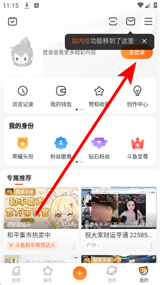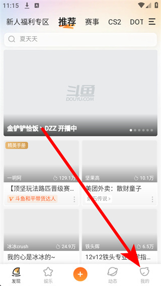 1、打开斗鱼,在首页点击底部导航栏的我的,进入个人页面。
