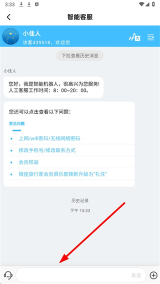 3、在智能客服页面,可直接在输入框中输入咨询内容,也可选择常见问题快速获取解答。