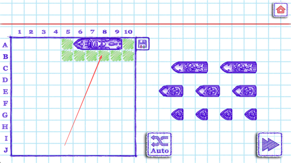 1、在网格区域布置己方舰船,将右侧舰船道具放置到左侧网格的合适位置,完成布局准备。