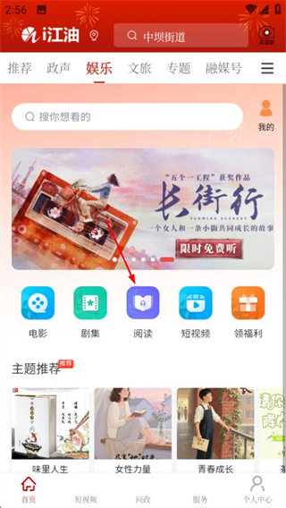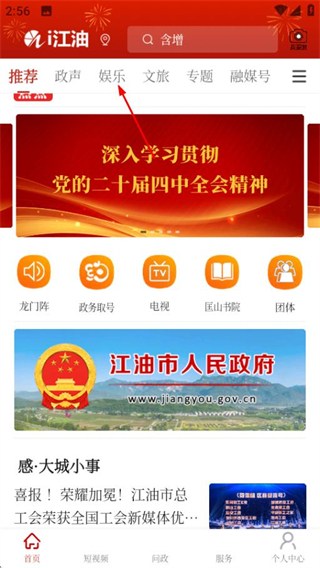 1、在i江油首页,点击顶部娱乐选项进入娱乐频道页面。