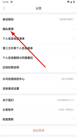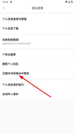 4、在隐私管理页面,点击注销木鸟民宿APP服务选项,按照提示完成账号注销操作。