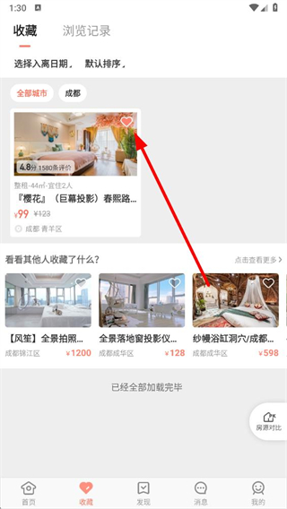 2、在收藏页面中,找到想要取消收藏的房源,点击其右上角的心形图标。