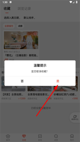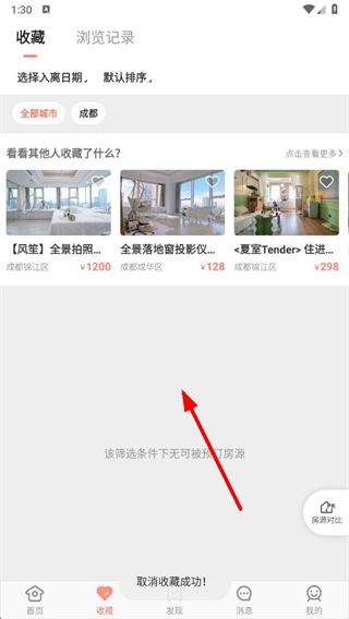 4、此时会显示取消收藏成功的提示,完成房源取消收藏操作。