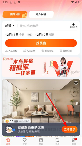 1、在木鸟公寓app界面底部,点击立即登录按钮,进入登录界面。