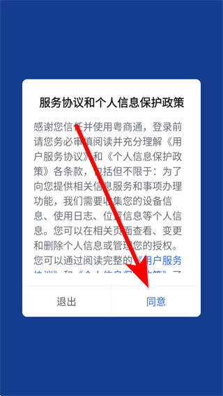 1、打开粤商通,进入后会弹出弹窗点击同意,进入应用主页面。