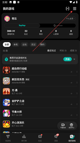 1、打开TapTap应用,在我的游戏页面,点击右上角的三条横线图标。