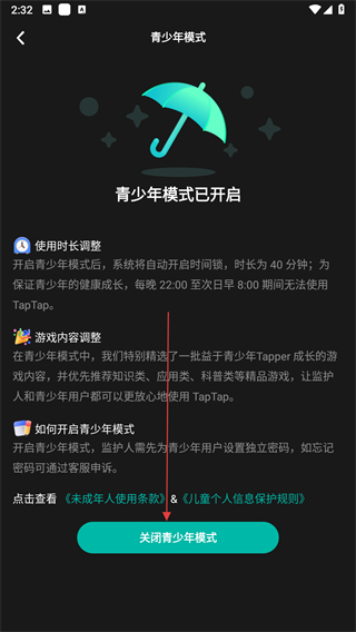 4、进入青少年模式页面后,点击关闭青少年模式按钮。