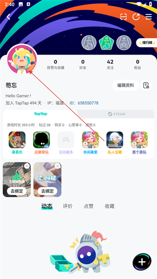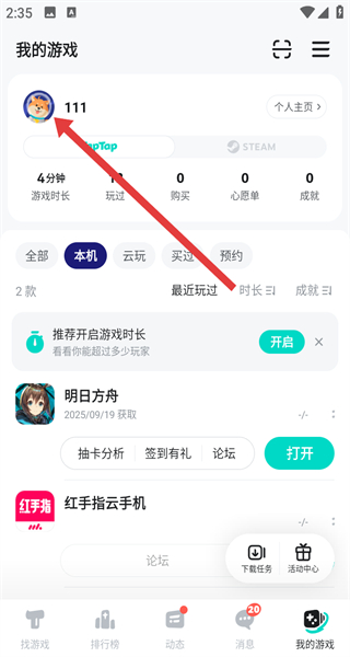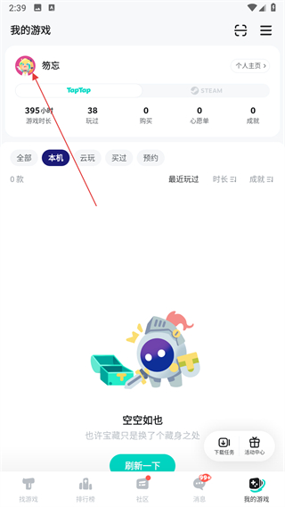 1、打开TapTap应用,进入我的游戏页面,点击左上角的个人头像。