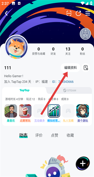 3、在个人主页,点击“编辑资料”按钮,进入资料编辑的操作页面。