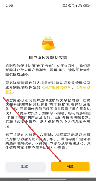 1、在打开布丁扫描app后,可通过点击同意按钮,进入使用。