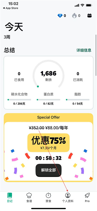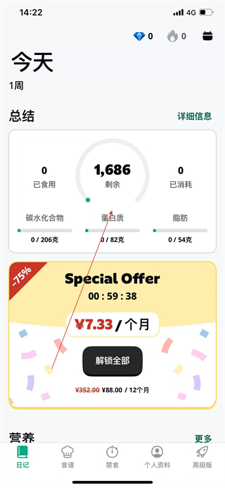 1、打开雅卓APP的日记页面,点击详细信息进入营养素摄入量页面。