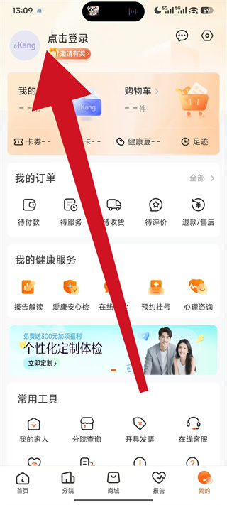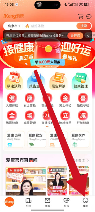 1、打开爱康体检,点击首页底部导航栏的我的,进入个人页面。