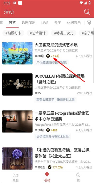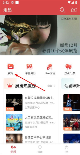1、在走起首页点击展览选项,进入展览活动列表页面。