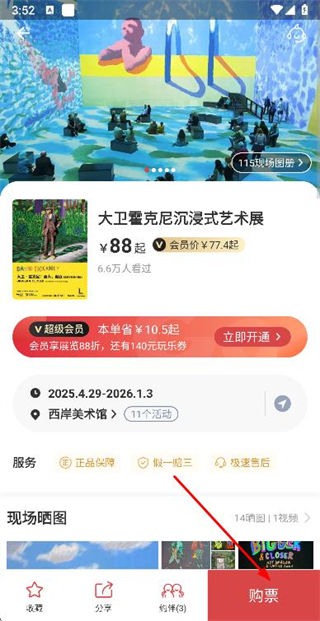 3、在展览详情页面点击购票按钮,完成该展览的购票流程。