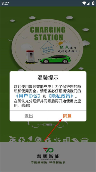 1、打开普顺智能充电后阅读温馨提示,点击同意按钮进入主界面。