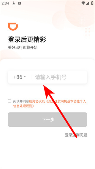 3、在登录页面的手机号输入框中,填写手机号码,同时勾选相关协议,随后点击页面中的下一步。