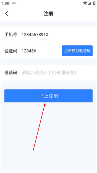 4、确认手机号和验证码已正确填写后,找到页面中的马上注册按钮,点击该按钮完成注册。
