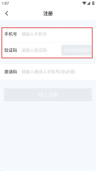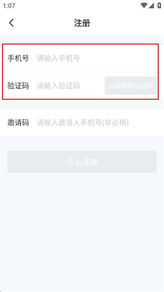 2、在注册界面的手机号输入框内,填写对应的手机号码,接着在验证码输入框准备后续填写。