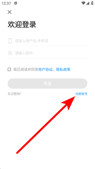 3、在欢迎登录页面,点击注册账号,进入注册账号页面。