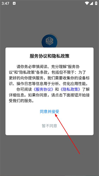 1、在服务协议和隐私政策弹窗中,点击同意,进入应用首页。
