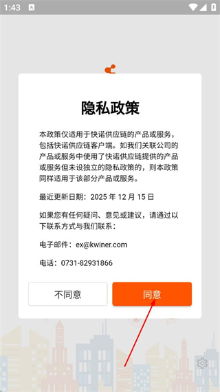 1、在快诺供应链的隐私政策弹窗中,点击同意,进入登录页面。