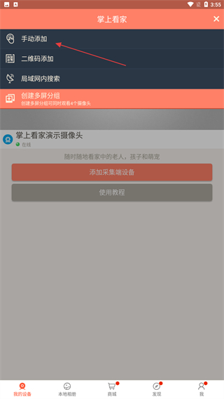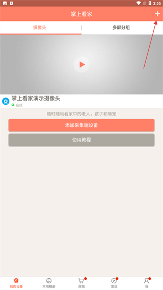 1、打开掌上看家APP,在首页右上方点击+的图标。