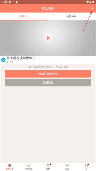 1、在掌上看家主界面右上角,点击+按钮,弹出添加设备的选项菜单。