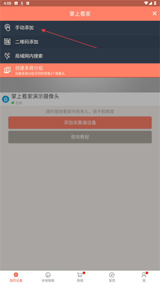 2、在弹出的菜单中,选择手动添加,进入添加摄像头的信息填写页面。