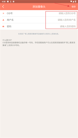 第二步:在手机端打开“掌上看家”应用,输入CID号及登录信息,即可连接观看。