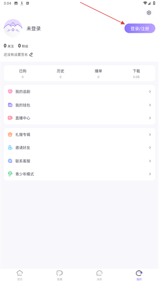 2、在个人中心页面右上角,点击登录/注册按钮,进入登录界面。
