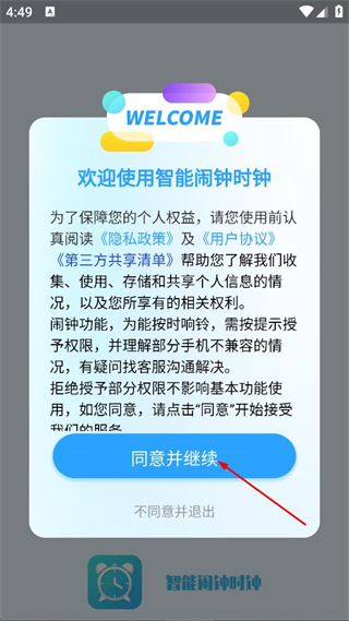 1、在欢迎使用智能闹钟时钟弹窗中,点击同意并继续,进入应用首页。