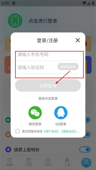 4、在登录/注册窗口,填写手机号码和验证码,可选择立即登录或其他方式完成登录。