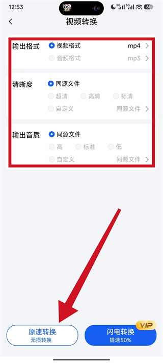 4、进入视频转换设置页面,选择输出格式,确认后点击原速转换,等待转换完成即可。